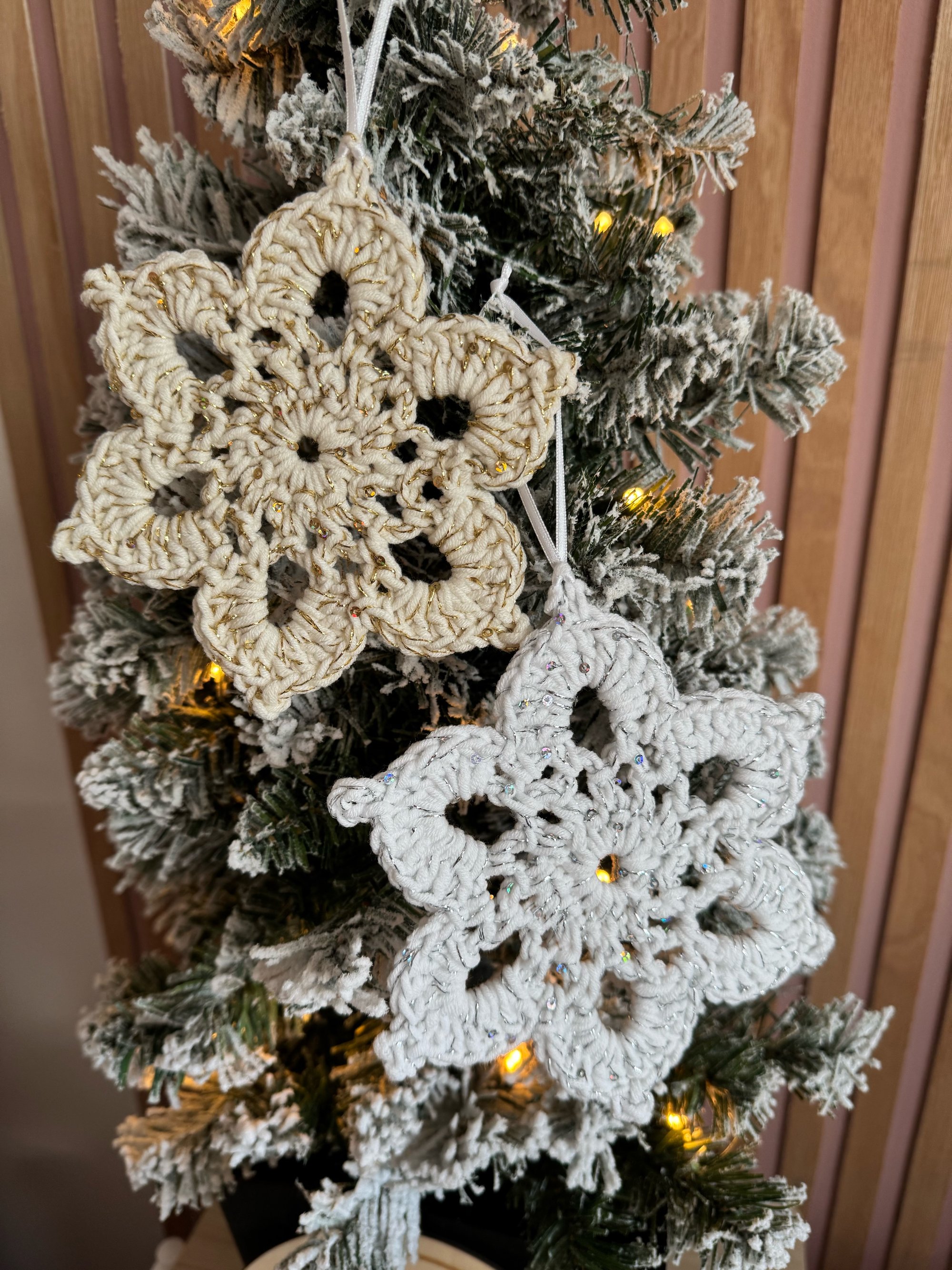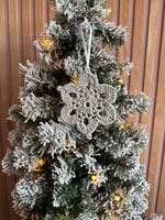 Handmade Christmas ornaments are the perfect accessory to add to any Christmas tree's or garlands to bring the festive cheer. Each individual snowflake has been handmade and are a blended cotton acrylic yarn. The sparkle snowflakes have been crochet with added tinsel yarn to give the sparkly effect. We have to sizes to choose from regular which are measured 12 cm each to the longest point and chunky which are measured 17 cm each to the longest point.